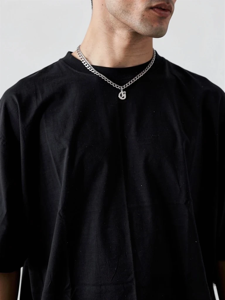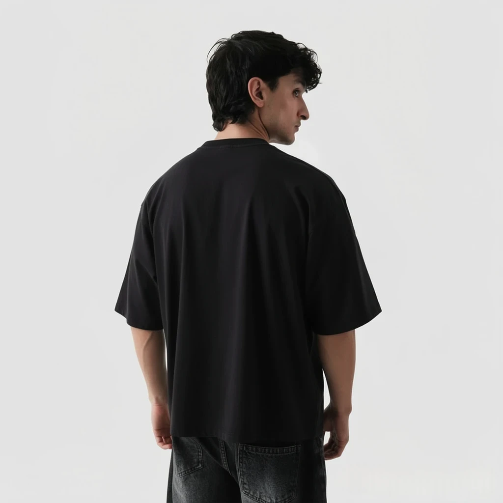 This is a versatile and contemporary black short-sleeved T-shirt featuring a relaxed, oversized fit.